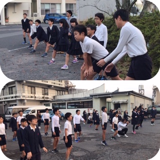 おはようございます。全員元気に、朝の集いを避難訓練の場所で行いました。体操をして目覚めました。