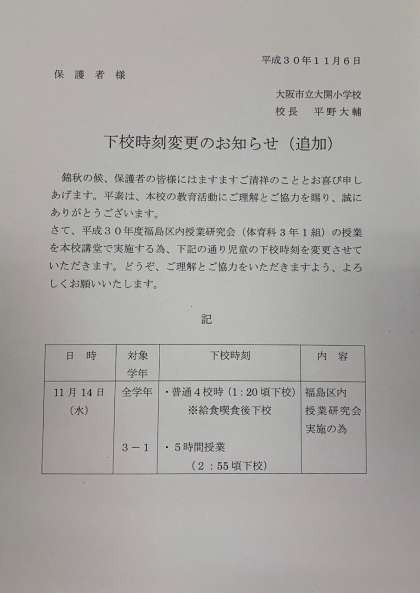 下校時刻変更について、追加のお知らせをさせていただきました。ご覧ください。
