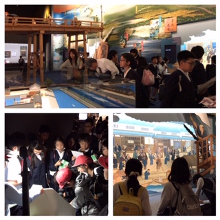 歴史博物館内を班の人と協力し合い見学しています。たくさんの資料が展示されています。