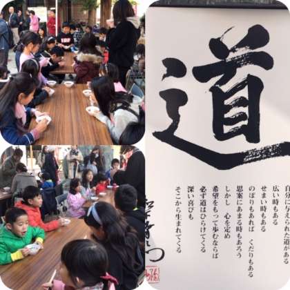 11月23日の勤労感謝の日に、松下幸之助さんの大好きであった、ぜんざいが振る舞われました。大開小学校の児童もたくさん参加しました。