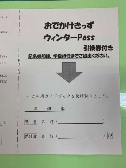 本日お出かけキッズウインターパスの引換券の配布を行いました!ご家庭で受け取りの確認をしていただきまして、受取証に記名捺印後担任まで、ご提出よろしくお願いいたします。