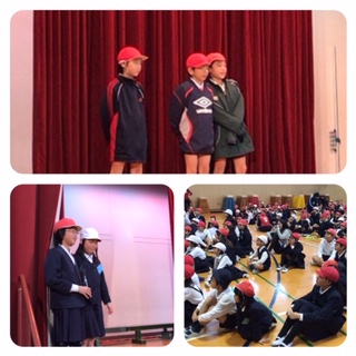 児童朝会で、「カーテンの中にだれがいるでしよう」のクイズを出題され、各グループで協力し合い一生懸命答えを見つけました。