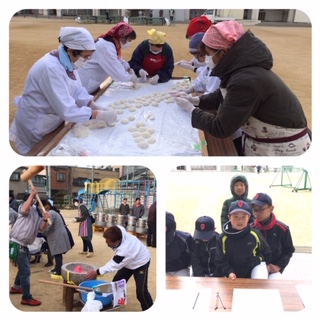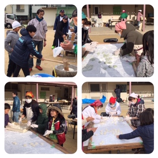12月8日、大開小学校の校庭で、餅つき大会が開催されました。今年は、杵でついたお餅と豚汁が振る舞われました。餅つき大会の受け付けにソフトボールのメンバーが協力してくれました。