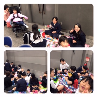 今昔館の3階ボールで楽しみにしていた、昼食の時間です。みんなで、手を合わせて、いただきます。