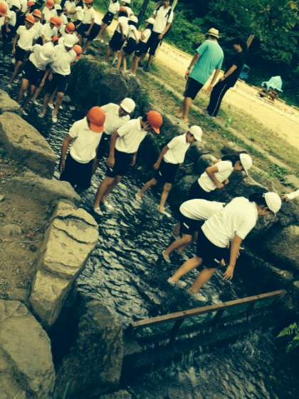 今にも雨が降りそうな中、最初のプログラムは「魚つかみ」です。山の流れは冷たく、子どもたちの手の間、足の間を逃げ回る魚に、歓声弾けるひとときでした。
