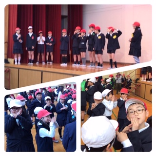 児童集会が講堂で行われました。ゼスチャークイズを班ごとに行い競争しました。みんなで協力しあって、クイズに挑戦しました。