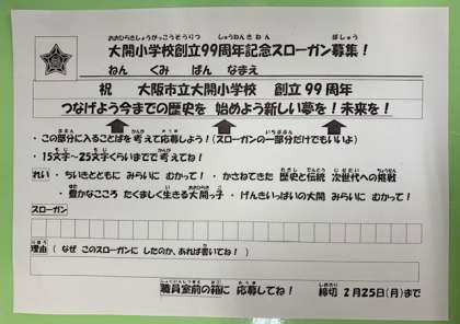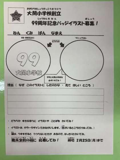 平成31年の4月より、わたしたちの大開小学校は、創立99周年を迎えます。小学校学校では、子どもたちにイラストやメッセージを募集して、創立99周年記念バッジと記念スローガンの製作を予定しています!こどもたちのたくさんの応募を楽しみにしています。