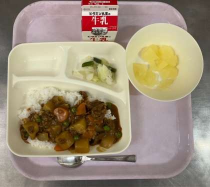 ビーフカレーライス、野菜のピクルス、りんご(カット缶)、牛乳 です。