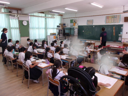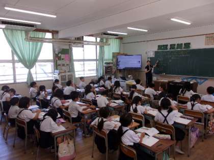 2年生は算数で「10のくらいより大きくなるひっ算のしかたを考えよう」というめあてで、百のくらいにも数字が並ぶことに気づけました。先生の話を聞きながらノートに丁寧にまとめています。