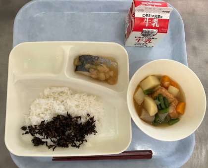 さごしのおろしじょうゆかけ、含め煮、牛ひじきそぼろ、ご飯、牛乳です。