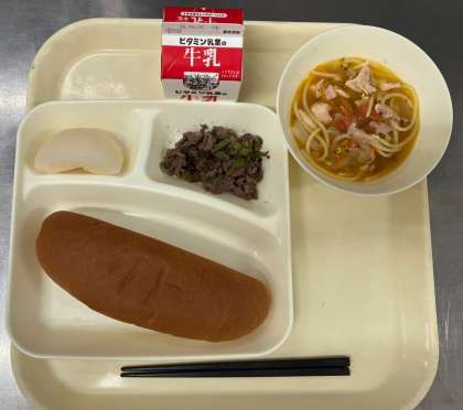 牛肉の香味焼き、トマトのスープスパゲッティ、なし(二十世紀)、黒糖パン、牛乳です。