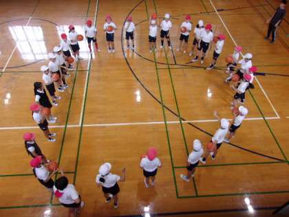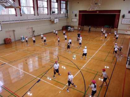 5−2は体育館でソフトバレーの練習をしていました。円になって全員で息をそろえる動きの練習や、アンダーハンドパスの練習をグループで協力して行っていました。