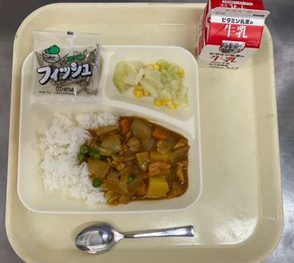 チキンカレーライス、キャベツとコーンのサラダ、ミニフィッシュ、ご飯、牛乳です。鶏肉、たまねぎ、にんじん、じゃがいも、グリンピースをじっくり煮込んで作ったカレーは、野菜の甘みと鶏肉のうま味が溶け合い、ご飯によく合います。子ども達に大人気でした。