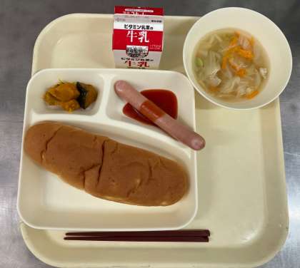 ウインナーのケチャップソース、スープ、焼きかぼちゃ、おさつパン、牛乳です。