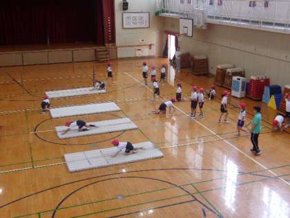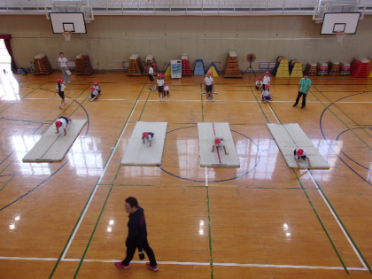 2−1はマット運動の授業を講堂で行っていました。初めから前転などをせず、体を慣らす運動から始めています。子どもたちはそれぞれ楽しみながら運動していました。