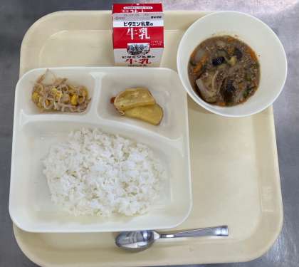 マーボーなす、ツナと野菜のいためもの、焼きさつまいもの甘みつかけ、ご飯、牛乳です。