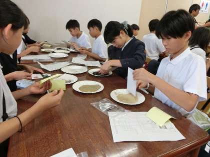 「ここにこのパーツを貼って…」「この砂の色、きれい!」