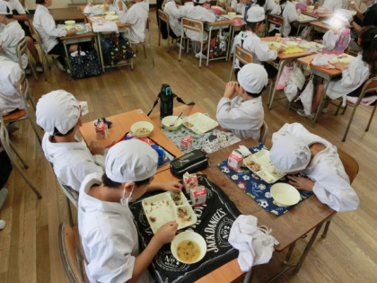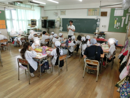 3‐2の給食タイムの様子です。食べながらも、先生の話に耳を傾けています。