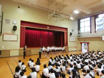 本日、児童朝会の時間を使って、先日行われた大会で素晴らしい成績を収めたソフトボールチームの表彰式を行いました。