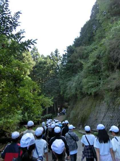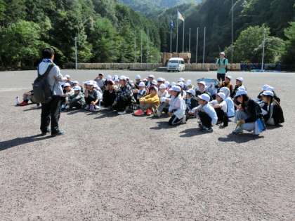 後ろにそびえる山々を見て、あの山に登るのかと期待と不安が入り混じったような表情の児童もいました。