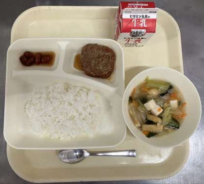 和風ハンバーグ、五目汁、金時豆の煮もの、ご飯、牛乳です。