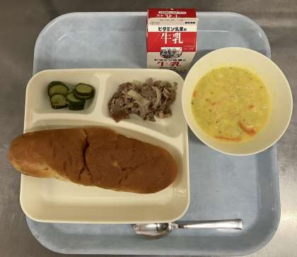 豚肉のガーリック焼き、コーンスープ、きゅうりのバジル風味サラダ、おさつパン、牛乳です。