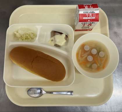 給食は、かつおのガーリックソースかけ、ウインナーとじゃがいものスープ、キャベツのサラダ、パンプキンパン、牛乳です。