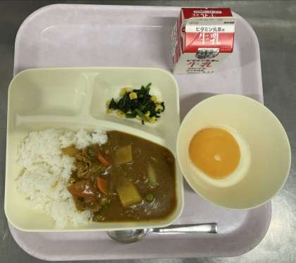 ポークカレーライス、ほうれんそうのソテー、黄桃(缶)、牛乳です。