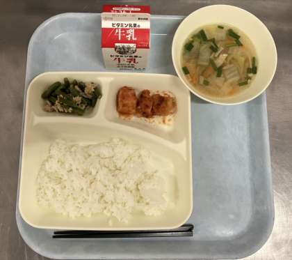 鶏肉のチリソース焼き、焼き豚のスープ、ツナとさんどまめのいためもの、ご飯、牛乳です。