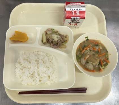 豚肉と野菜のいためもの、いわしのつみれ汁、かぼちゃういろう、ご飯、牛乳です。
