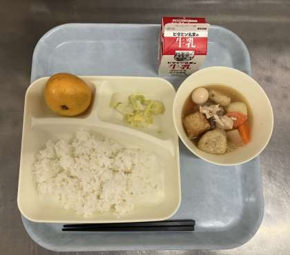 関東煮、はくさいの甘酢あえ、みかん、ご飯、牛乳です。