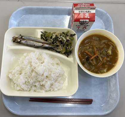 焼きししゃも、和風カレー汁、ささみとこまつなのいためもの、ご飯、牛乳です。