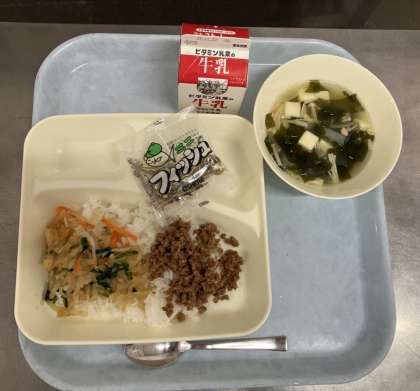 ビビンバ、わかめスープ、ミニフィッシュ、ご飯、牛乳です。