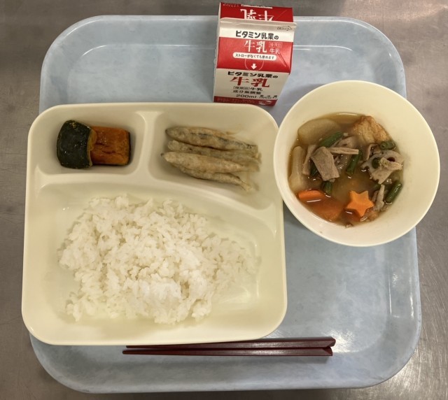 きびなごてんぷら、豚肉とあつあげの煮もの、焼きかぼちゃの甘みつかけ、ご飯、牛乳です。