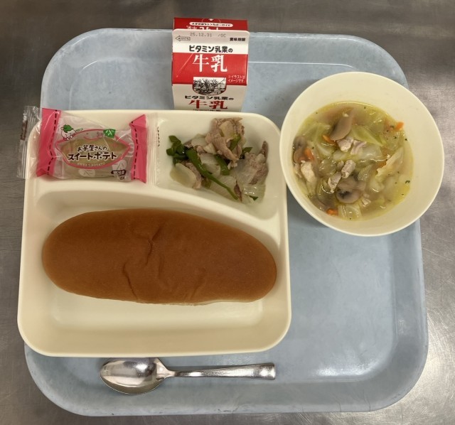 豚肉と野菜のソテー、スープ、スイートポテト、黒糖パン、牛乳です。