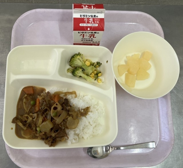 冬野菜のカレーライス、ブロッコリーとコーンのサラダ、和なし(カット缶)、牛乳です。