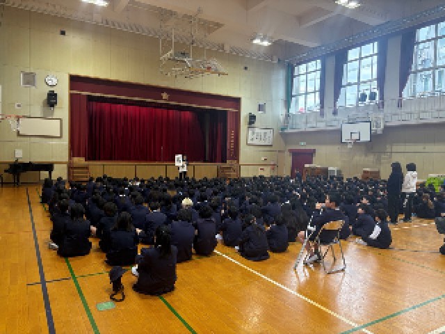 子どもたちは講堂に集合し、校長先生の「午(うま)年」についてのお話を、静かに聞くことができました。