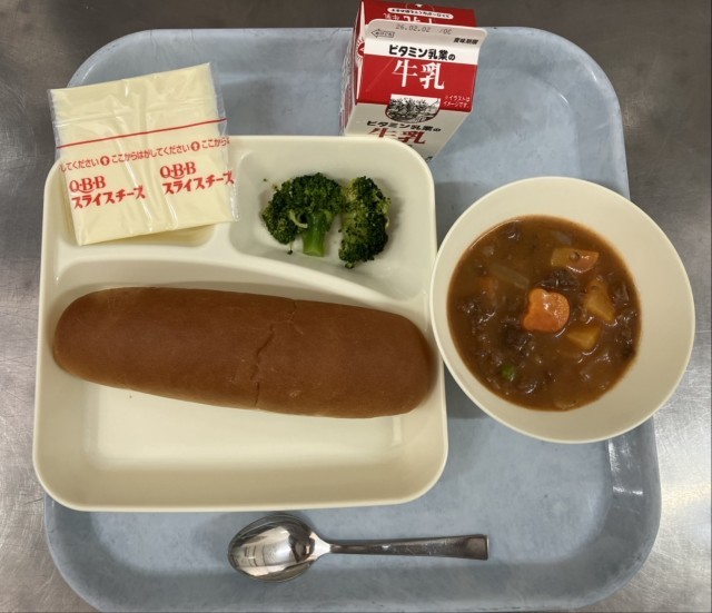 ビーフシチュー、ブロッコリーのサラダ、スライスチーズ、黒糖パン、牛乳です。