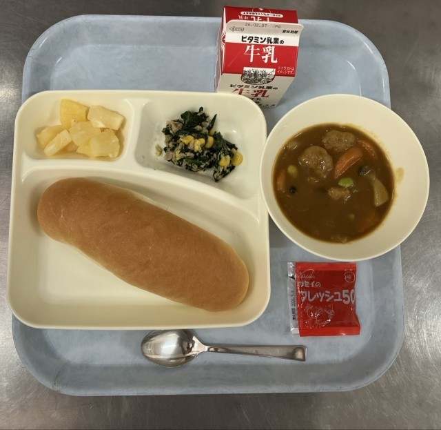 ミートボールと野菜のカレー煮、ツナとほうれんそうのソテー、パインアップル(カット缶)、コッペパン、いちごジャム、牛乳です。