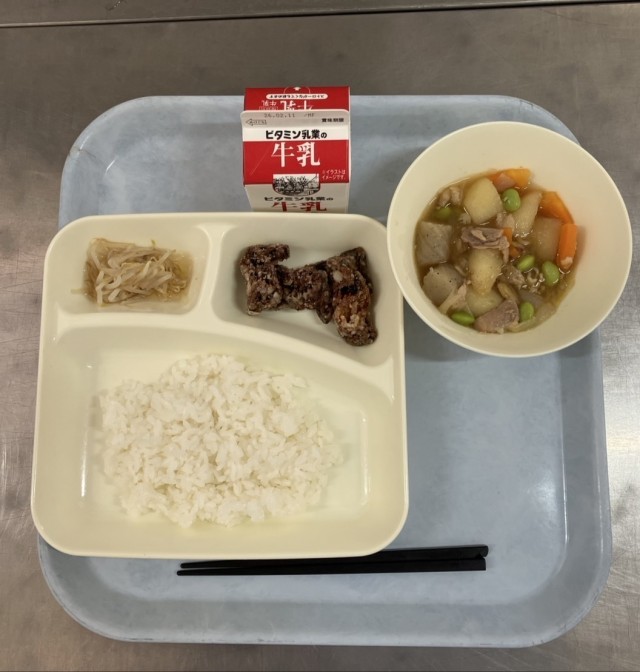 くじらのたつたあげ、豚肉とじゃがいもの煮もの、もやしの甘酢あえ、ご飯、牛乳です。