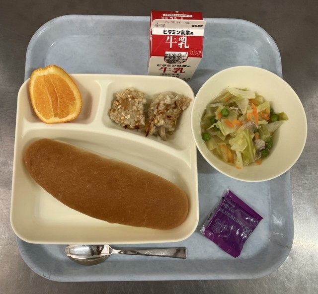 押麦のグラタン、スープ、いよかん、コッペパン、ブルーベリージャム、牛乳です。