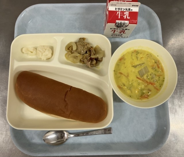 豚肉のカレー風味焼き、コーンスープ、カリフラワーのピクルス、黒糖パン、牛乳です。