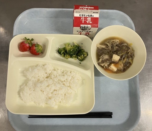 すき焼き煮、ブロッコリーのしょうがづけ、いちご、ご飯、牛乳です。