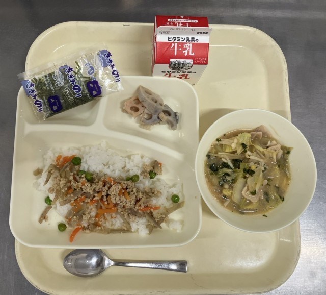 鶏ごぼうご飯、きざみのり、みそ汁、焼きれんこん、ご飯、牛乳です。