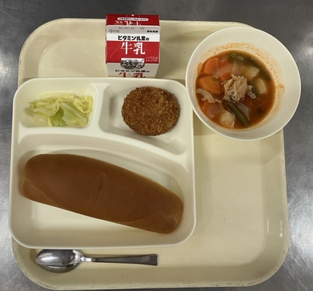 チキンレバーカツ、ケチャップ煮、キャベツのサラダ、黒糖パン、牛乳です。
