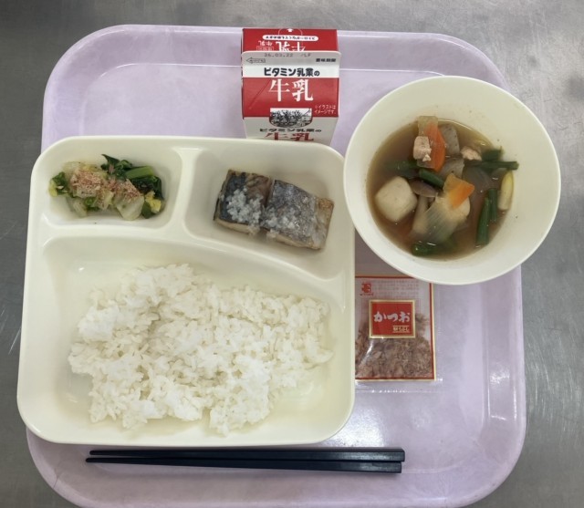 さごしの塩こうじだれかけ、さといもと野菜の含め煮、なのはなのおひたし、かつおぶし、ご飯、牛乳です。