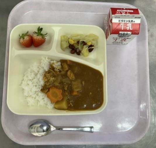 本日の献立は、チキンカレーライス、金時豆と野菜のサラダ、いちご、ごはん、牛乳でした。