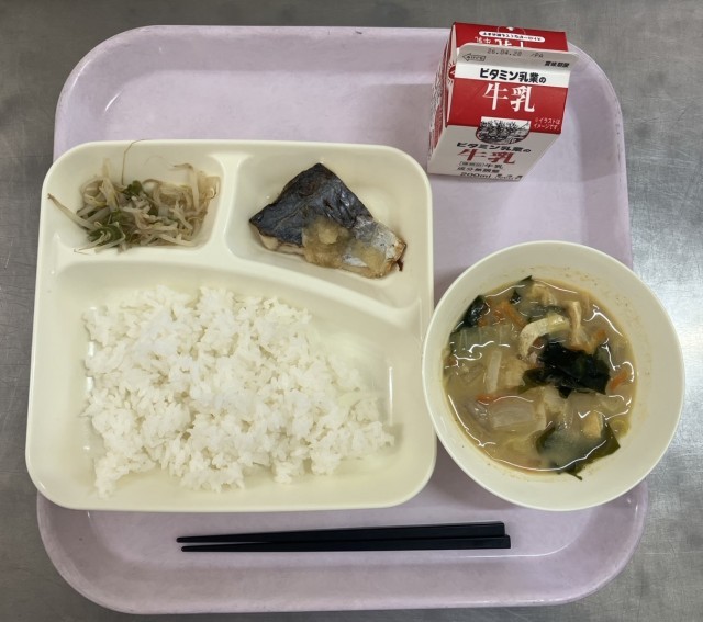 さごしのおろしじょうゆかけ、みそ汁、もやしとピーマンのいためもの、ご飯、牛乳です。