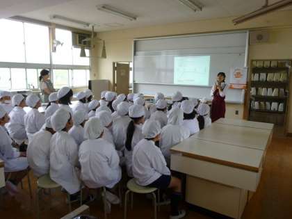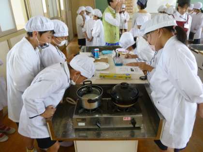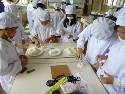 5年生の出前授業がありました。ライフではなく「Rice」。お米の特性を知りおいしいご飯を炊くための「食育」です。金属の鍋と土鍋では、火加減や、炊いたりむらしたりする時間に差があることを学習しました。たきたてのご飯で握ったおにぎりは、のりを巻かなくても抜群の味でした。