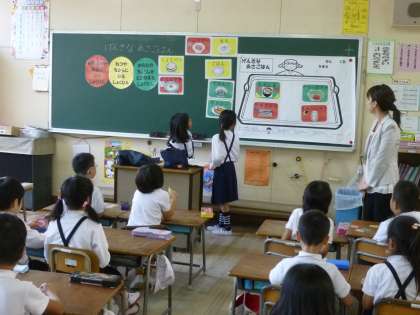2年生では、来校いただいた栄養指導の先生による「げんきなあさごはん」について学習しました。赤・黄・緑の栄養をバランスよく組み合わせることが大切であることを、楽しい掲示を見ながら学習しました。